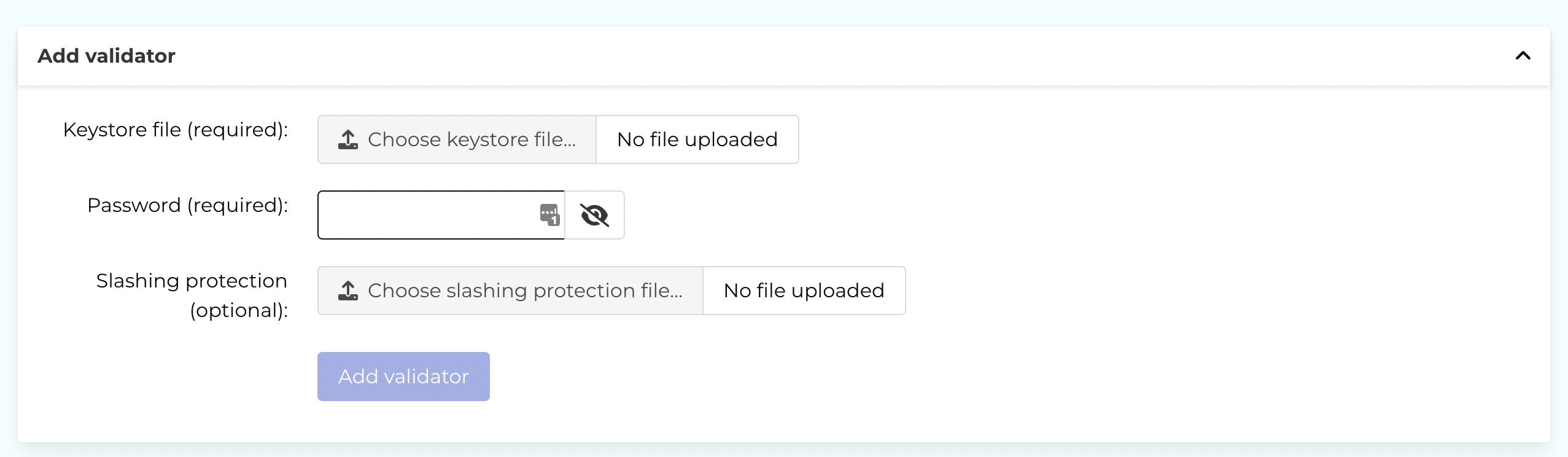 - Repeat for all your keys. If your keys all have the same password, you leave the password field as is, and immediately click Add Validator after selecting the next keystore file.