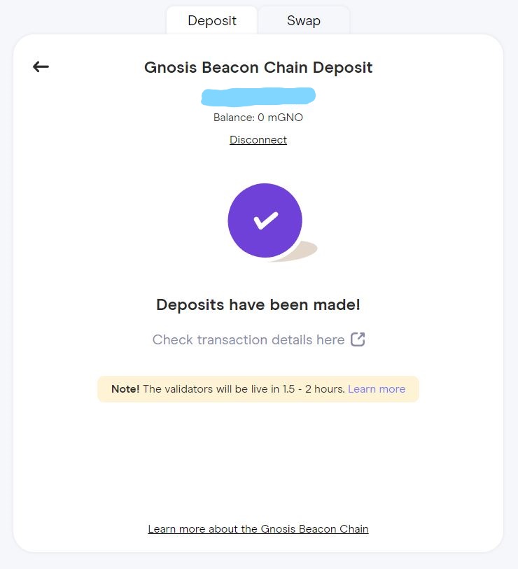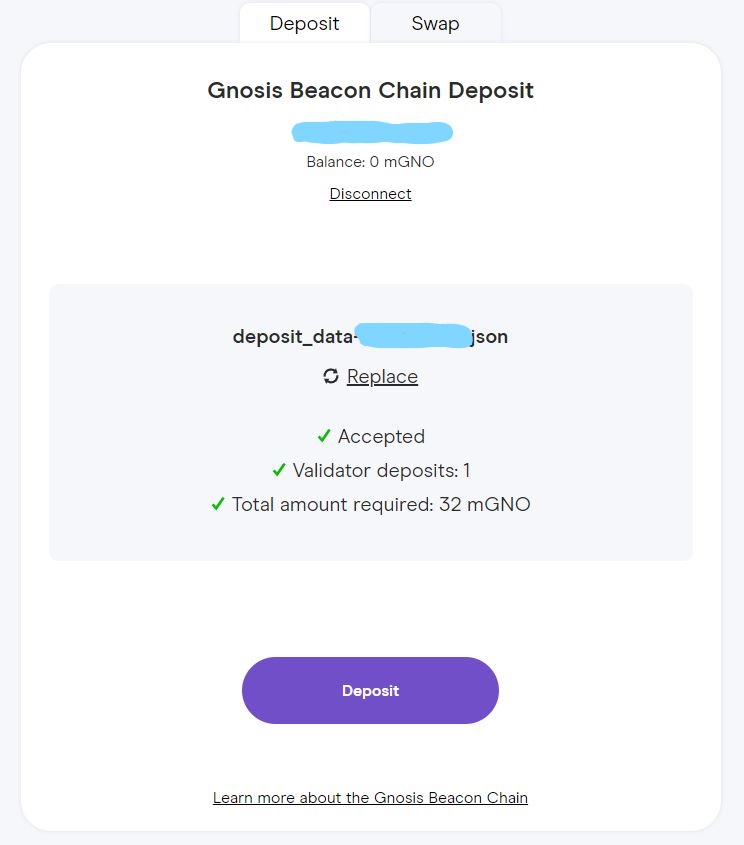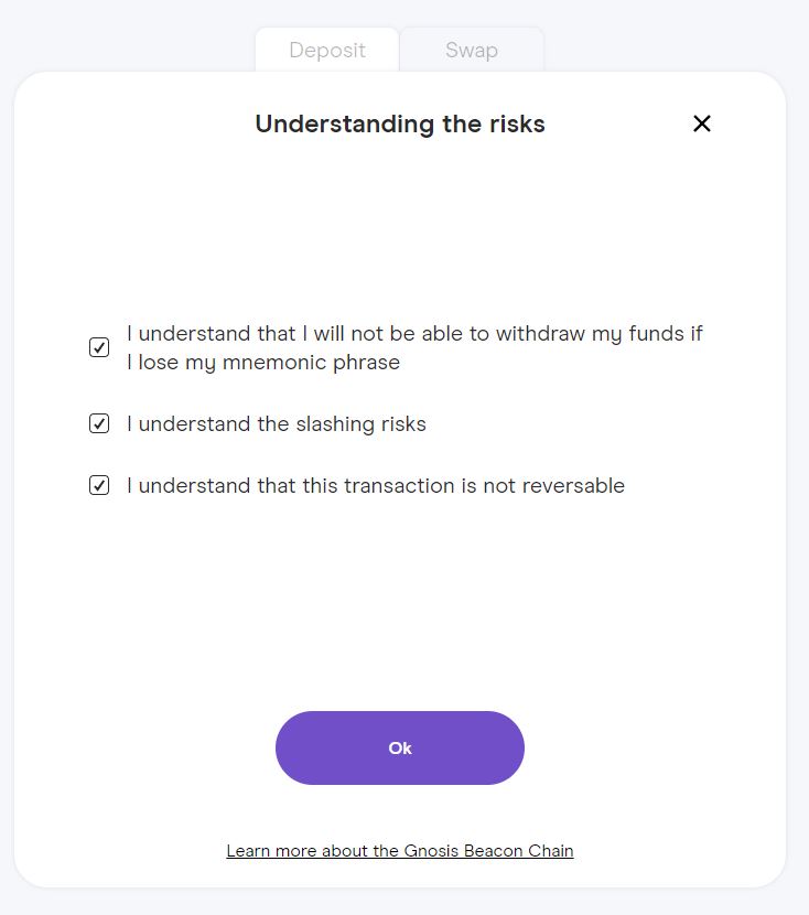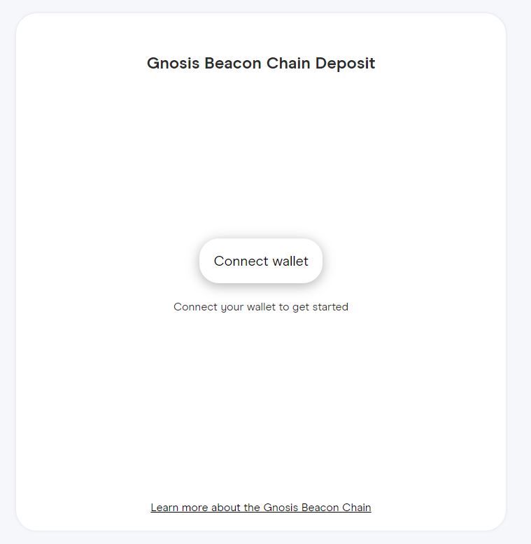 Warning! Visiting the official Gnosis Beacon Chain Deposit website is the ONLY way you should make the desposit. Do not attempt to manually send funds to the deposit contract or your will lose your funds.