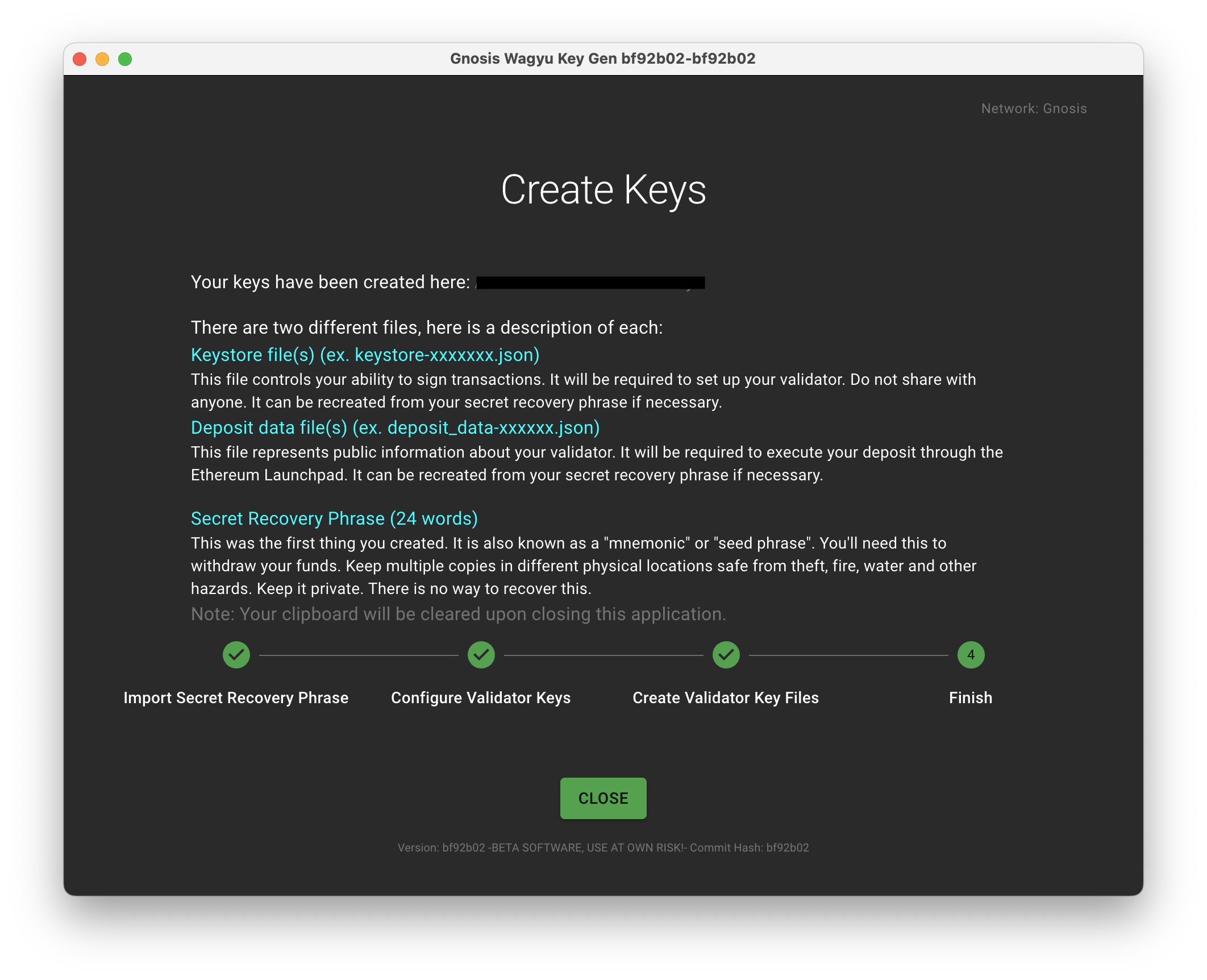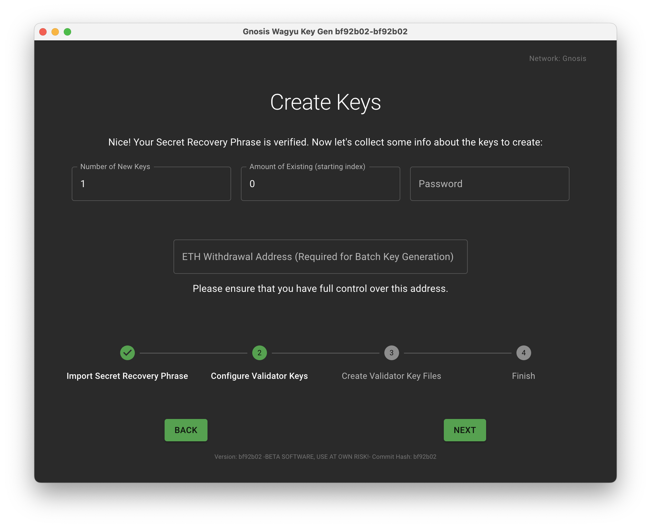 Note that if you wish to run more than 1 validator, the EASIEST way to do this is to create a new keystore, deposit data and a new mnemonic phrase for each individual validator and then make individual deposits of 1 GNO each. You can create multiple keys in a batch using the existing key generator, and that will generate multiple keys with ONE deposit data file. Only do this if you have enough funds to make the deposit for the number of keys you generate or you will have a bad time when you get to Step #5. Whatever you do, keep careful track of whatever keys you make and keep them and the other files together and consider some type of naming scheme so you don’t get confused later on.