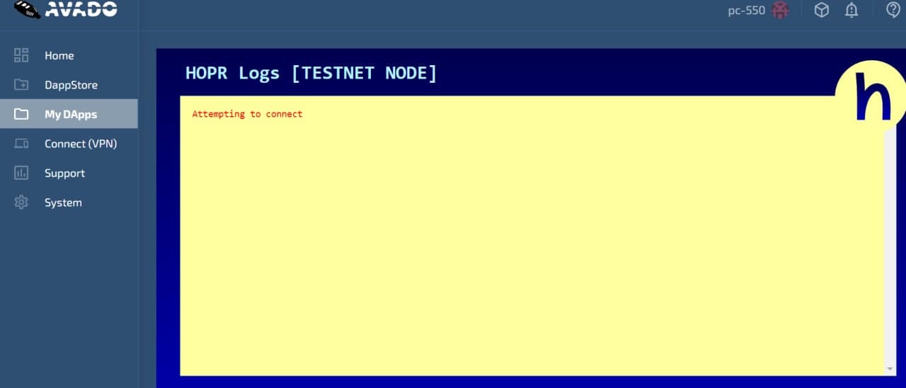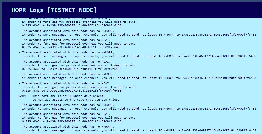 - Click: “HOPR client” > to see: “HOPR Logs [TESTNET NODE]”