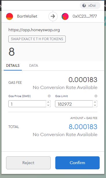 - Select the proper tokens to swap and fill out the amount to swap. In this example 8 xDAI will be converted to HOPR (xHOPR). You can also fill out 10 as the HOPR amount to swap to. You wil see there is a little gas fee (in xDAI ?). So be sure you have some xDAI left in your wallet.