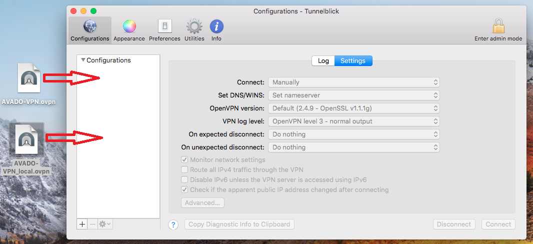 Start by importing the Local (LAN) profile. Select File and then follow the prompt and drag the Local (LAN) file (AVADO-VPN_local.ovpn) into the window to import it.