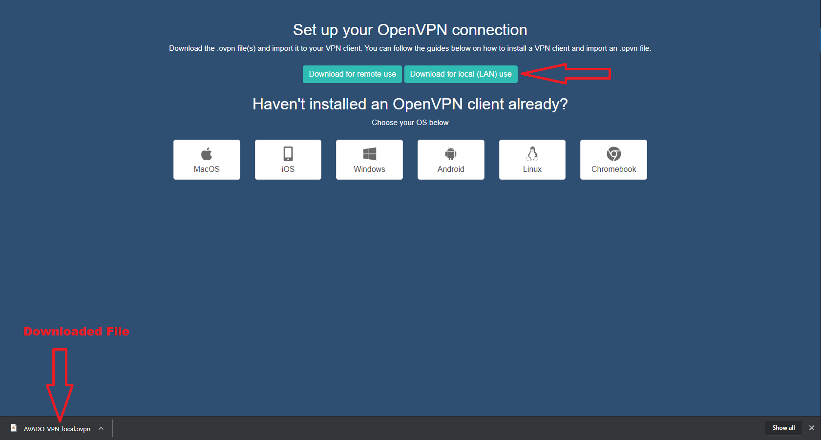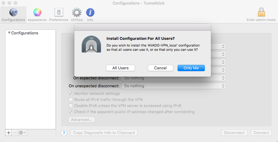 Once you have downloaded the Local (LAN) and remote configuration files, you should disconnect from the Avado WiFi network and re-connect to your home network. This step is important and easy to overlook. If you forget to disconnect from the Avado WiFi network and re-connect to your home network, when you try to connect with your VPN client in the next steps it won’t work. :(