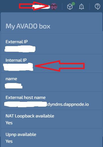 You will need to get your Avado Internal IP address to complete the port forwarding rule. To do this, open a new browser tab and navigate to your Avado dashboard (using your Local LAN VPN :)). Click on the computer avatar icon in the upper right corner. Copy the Internal IP.