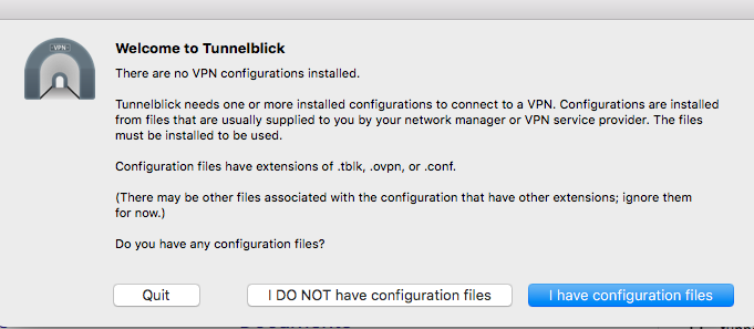Open the Tunnelblick application and you will see a configuration screen. Select I have configuration files.