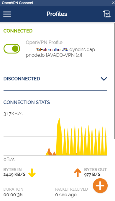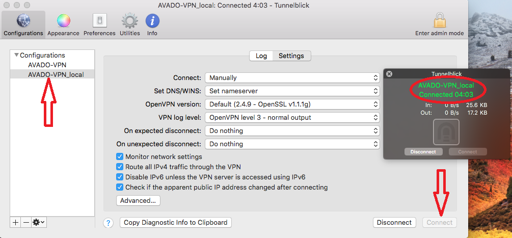 Then simply select the profile you would like to connect, starting with the local configuration. Make sure you are connected to your home network and not the Avado WiFi. Then click Connect in the lower right corner and a small window will pop up showing your successful connection.