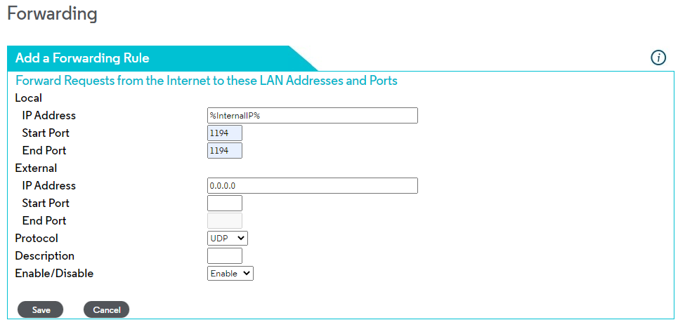 Now go back to the tab with your router admin page. Paste your Internal IP in the Local IP box with a start and end port of 1194. Leave the External IP as 0.0.0.0 and the start port blank. Set the protocol to UDP and select Enable. Don’t forget to hit Save to save the rule to your router. Then you can logout of your router.