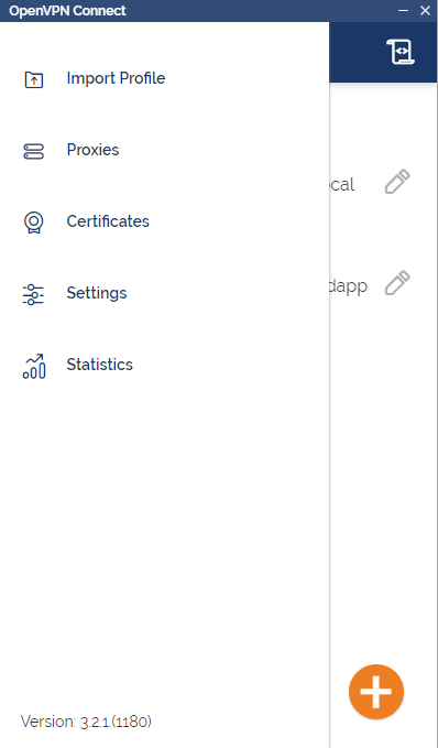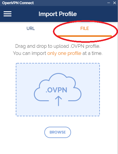 Open the OpenVPN application and click on the 3 bar menu icon in the upper left corner and then select Import Profile.