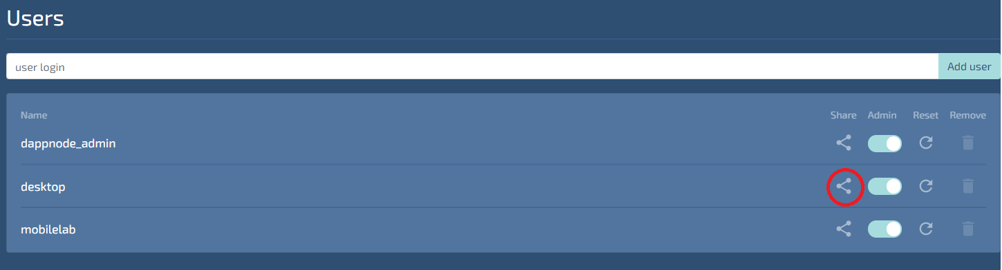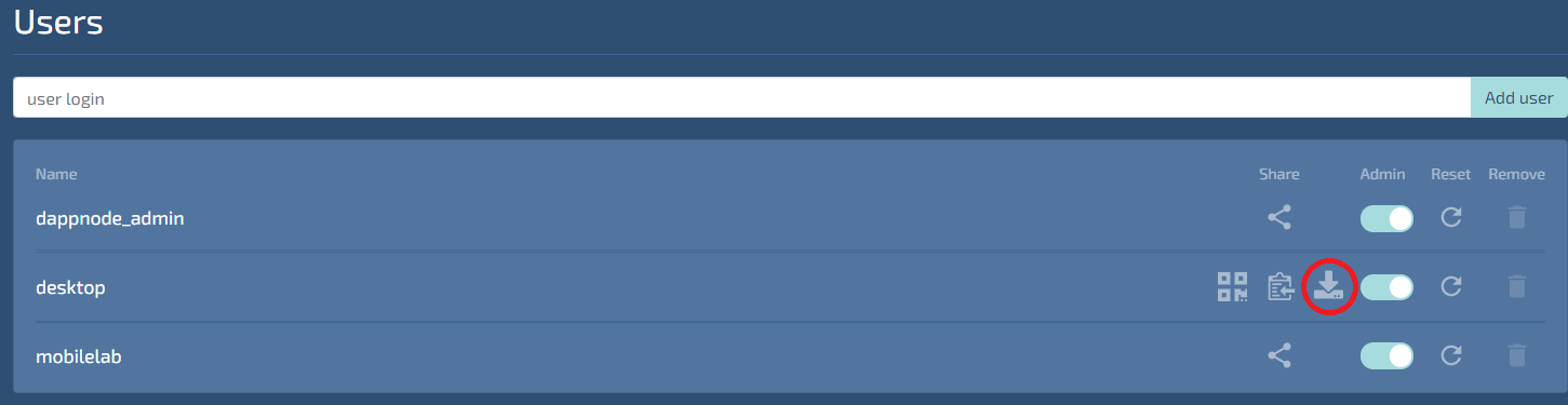 When the Users menu opens, you will see a pre-configured user named dappnode_admin. Admin rights for this user should be set to on by default. It is recommended to add additional users for your desktop/laptop and mobile device(s). You can remove Admin privleges or delete access for individual users if needed for unfortunate events such as losing your device. :(